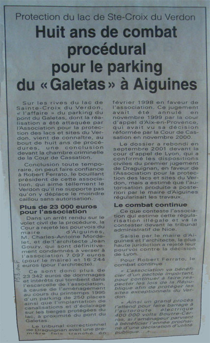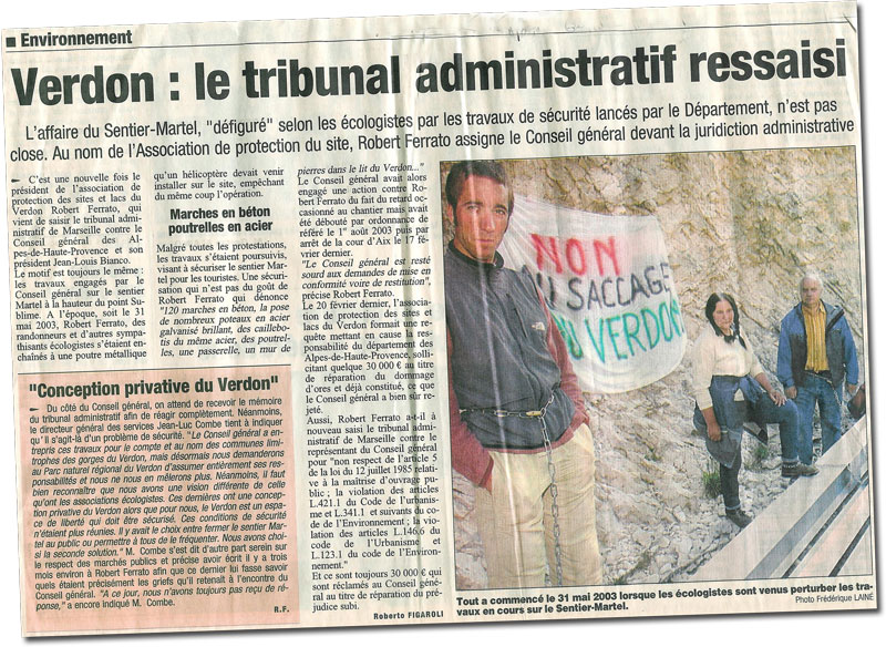 Nous avons attaqué le décret ministériel en Conseil d’Etat en prenant pour avocat l’ancienne ministre de l’Ecologie, Corinne Lepage … mais celle-ci ne nous avait pas dit qu’elle n’était pas agréée pour plaider en Conseil d’Etat ! En catastrophe, n’ayant pas les moyens financiers de prendre un avocat agréé, Robert FERRATO est monté à Paris et a su si bien plaider cette cause que le président du Conseil d’Etat est venu observer le site en hélicoptère.