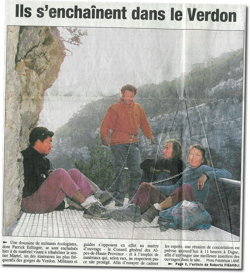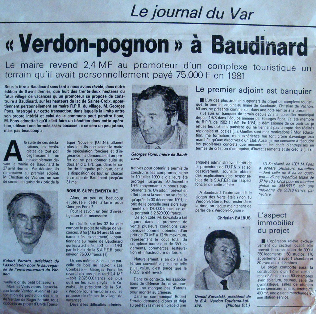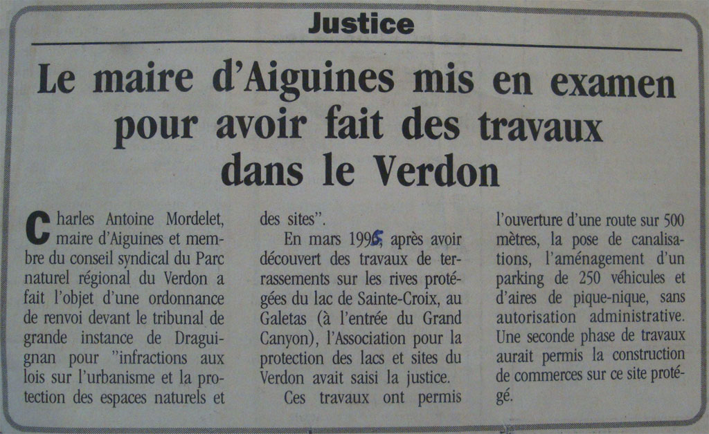 surnommée « la cigale verte » (celle qui chante mais ne fait rien!), a accordé le passage d’une ligne de Très Haute Tension (THT) de 400.000 volts sur les rives du Lac de Sainte-Croix, et la traversée des gorges afin de « sécuriser » en électricité la région de Nice. En fait, avec l’abandon du surgénérateur de Creys-Malville, nous nous trouvions en surproduction d’électricité car 4 groupes nucléaires avaient été mis en place pour fabriquer le plutonium pour le surgénérateur et la connexion avec l’Italie pouvait s’effectuer facilement via les Alpes-Maritimes.