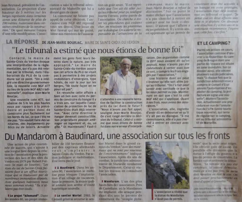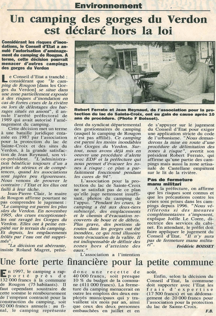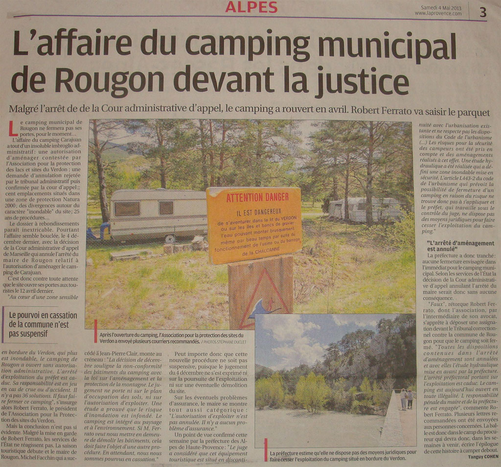 D’ailleurs, l’autorité environnementale, qui dépend du Ministère chargé de l’environnement, s’est elle aussi émue de l’insuffisance des mesures de protection et de contrôle en donnant un avis défavorable au renouvellement de la Charte rédigée par le Parc Régional du Verdon.